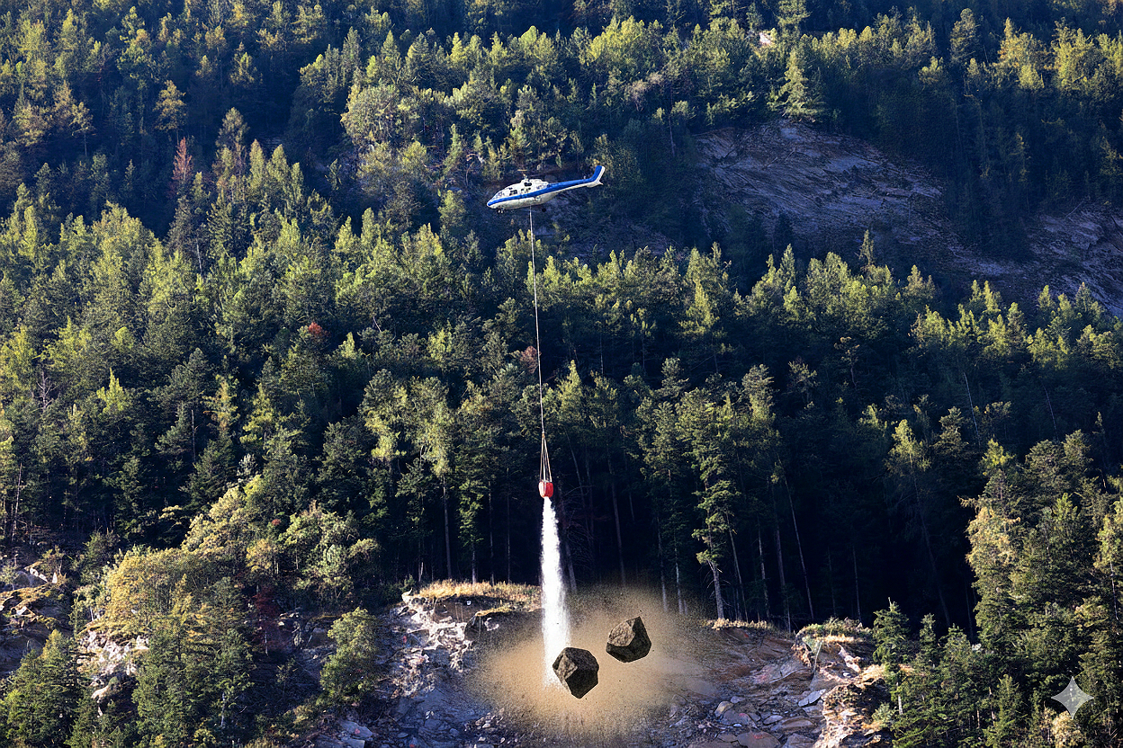 L'hélicoptère peut amener ce matériel lourd directement sur la paroi.